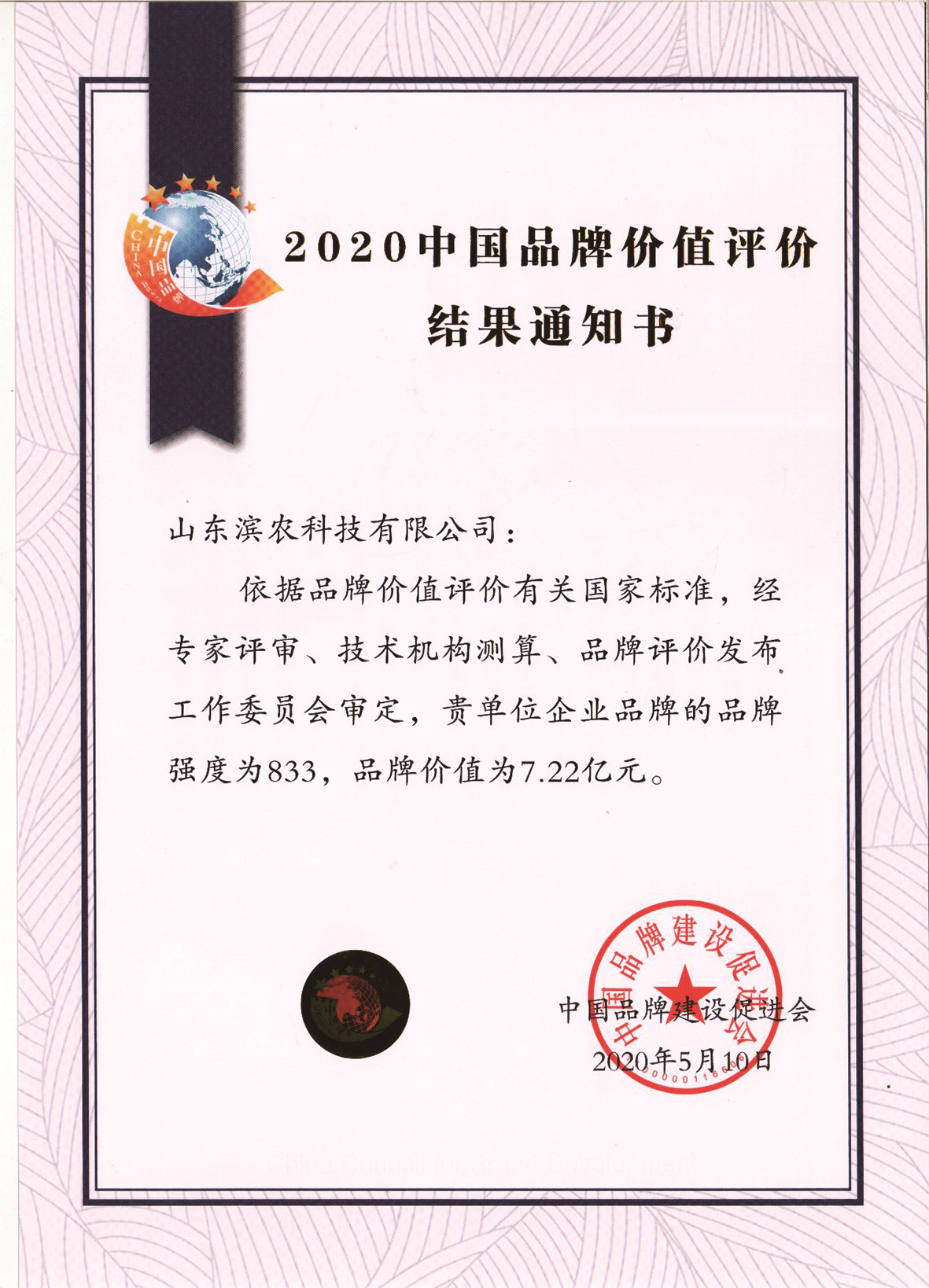 ■2020-05-10 我公司企業品牌的品牌強度為833,品牌價值為7.22億元