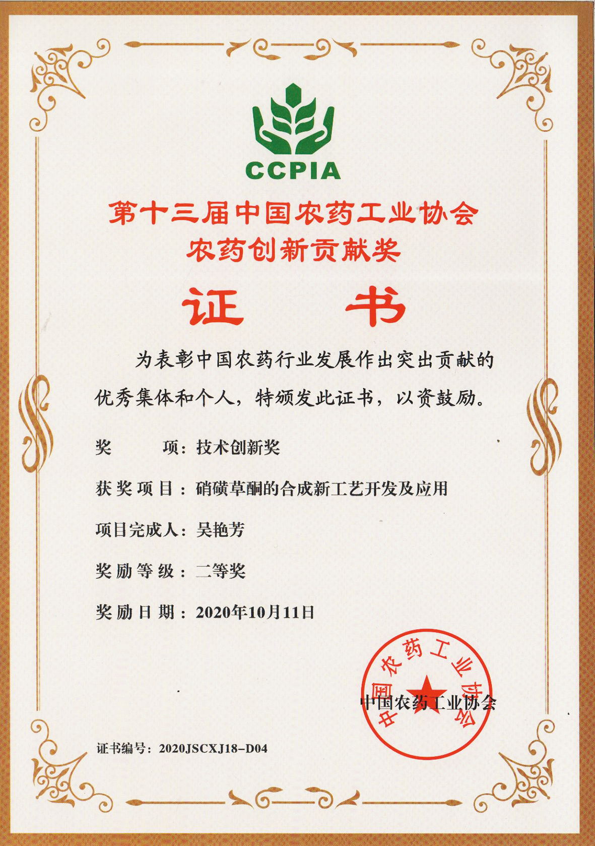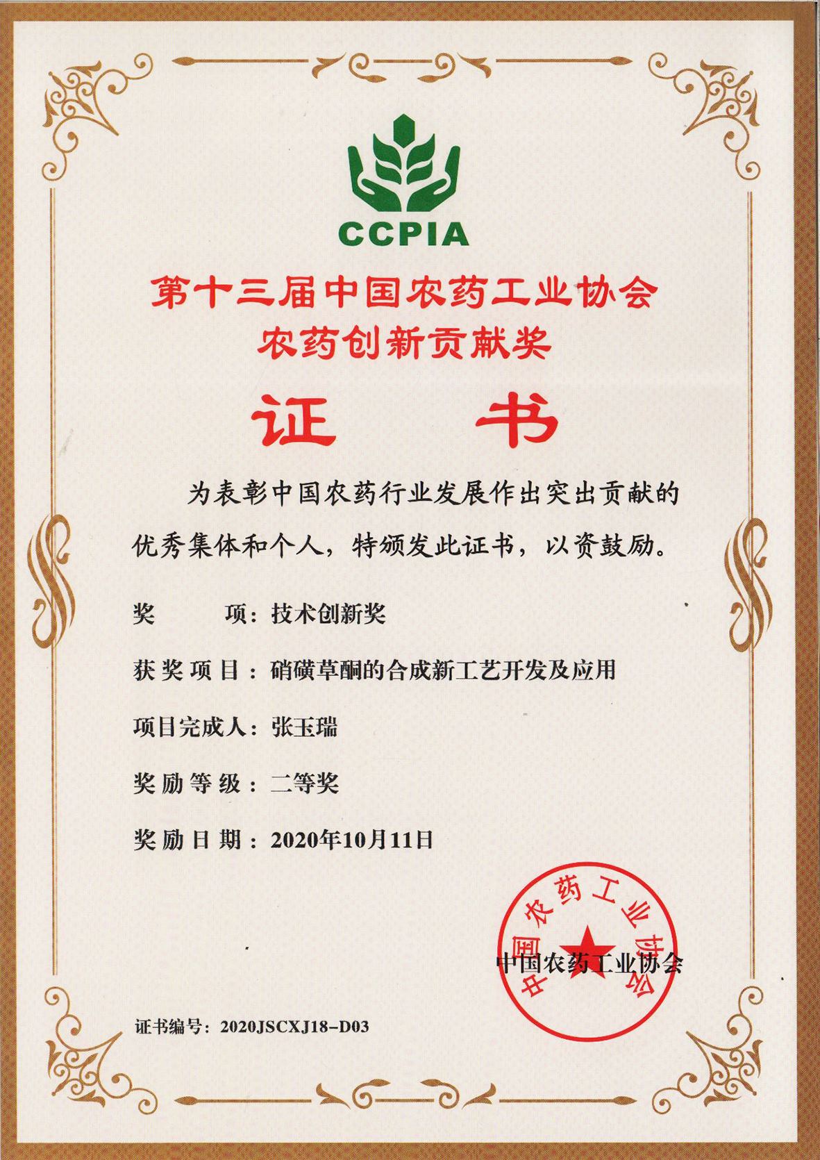 ■2020-11-05 我公司“硝磺草酮的合成新工藝開發及應用”項目榮獲技術創新獎