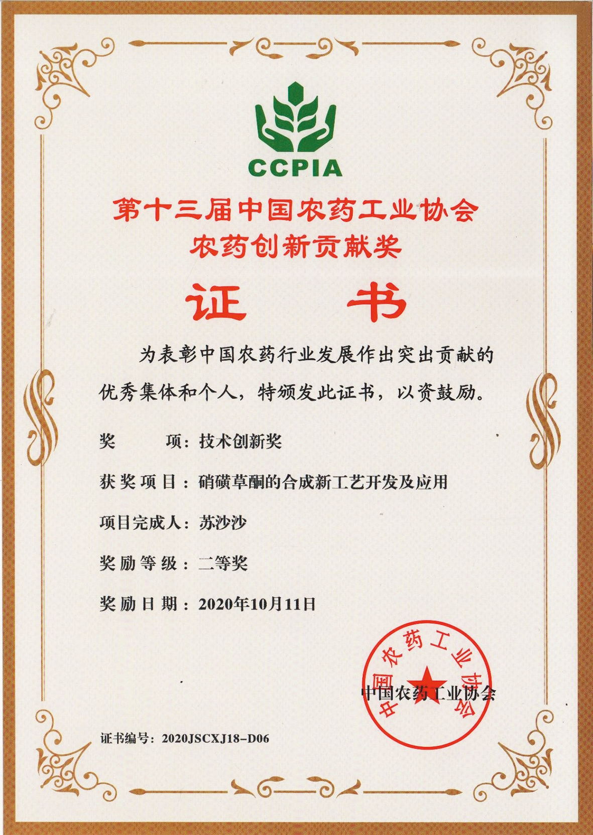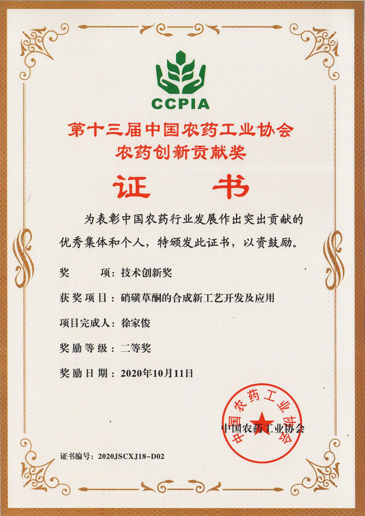 ■2020-11-15 2020-11-05 我公司“硝磺草酮的合成新工藝開發及應用”項目榮獲技術創新獎