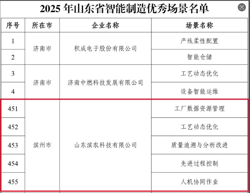 近日,山東省工業(yè)和信息化廳公布了2025年先進(jìn)級(jí)(省級(jí))智能工廠和智能制造優(yōu)秀場景培育認(rèn)定名單,濱農(nóng)科技獲評(píng)2025年山東省先進(jìn)級(jí)(省級(jí))智能工廠,其中工廠數(shù)據(jù)資源管理、工藝動(dòng)態(tài)優(yōu)化、質(zhì)量追溯與分析改進(jìn)、先進(jìn)過程控制、人機(jī)協(xié)同作業(yè)獲評(píng)2025年山東省智能制造優(yōu)秀場景。