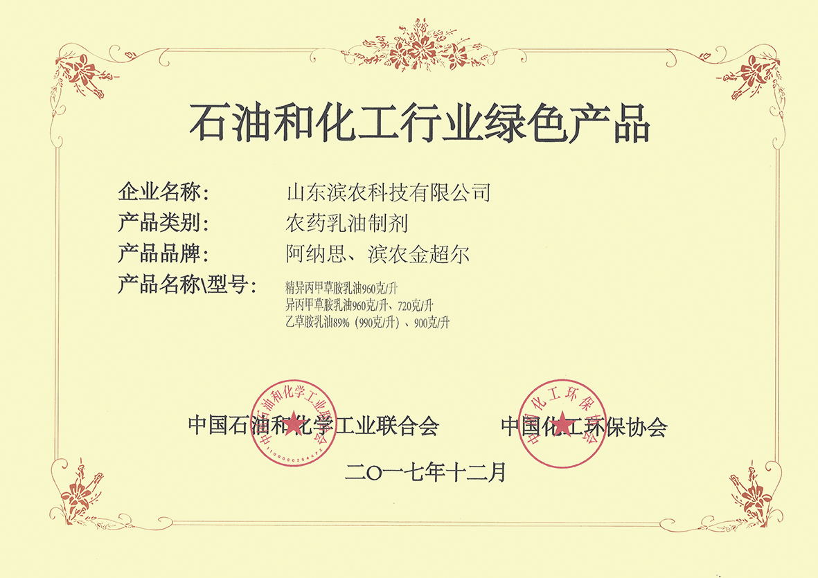 12月14日,由中國石油和化學工業聯合會和中國化工環保協會主辦的“2017年石油和化工行業綠色發展大會”在北京隆重召開,山東濱農科技有限公司農藥乳油制劑 “960 克/升精異丙甲草胺乳油”“960 克/升、720 克/升異丙甲草胺乳油”“89%(990 克/升)、900 克/升乙草胺乳油”等產品被認定為“石油和化工行業綠色產品”并獲頒證書。