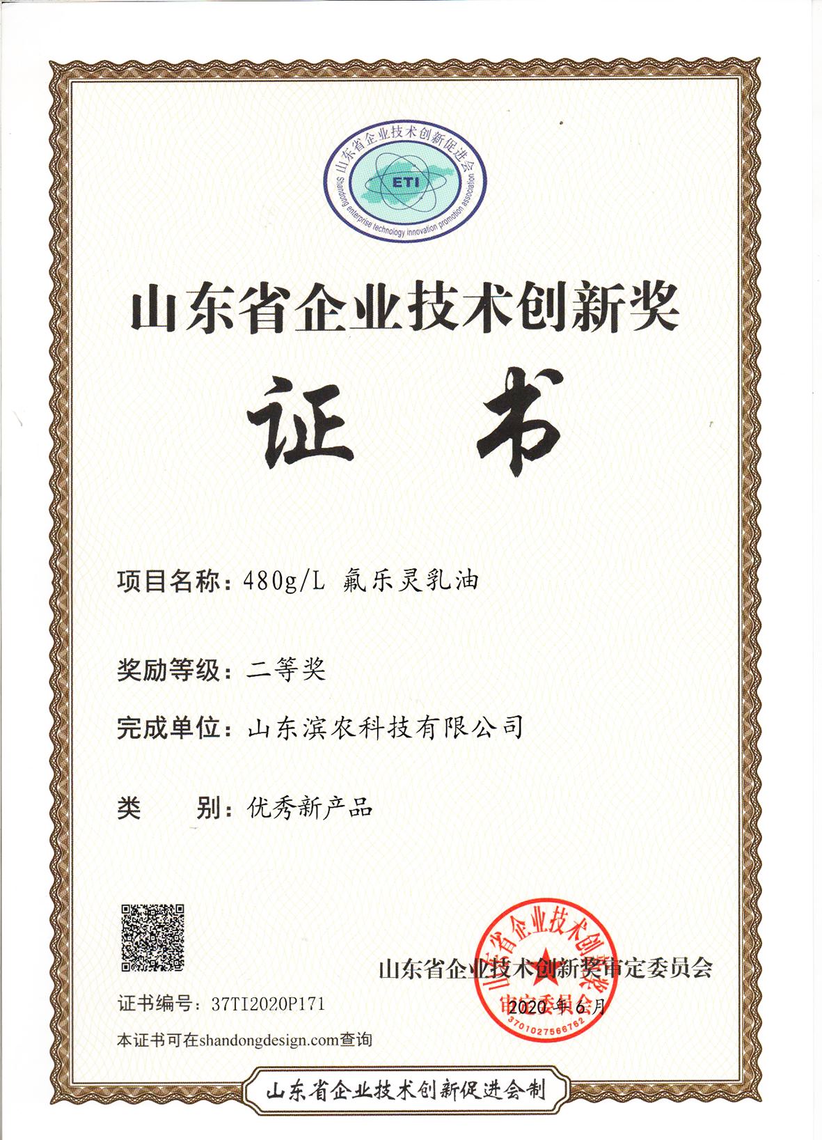 • ■2021-04-08 2020-08-05 我公司新產品480g/L氟樂靈乳油榮獲山東省企業技術創新獎優秀新產品二