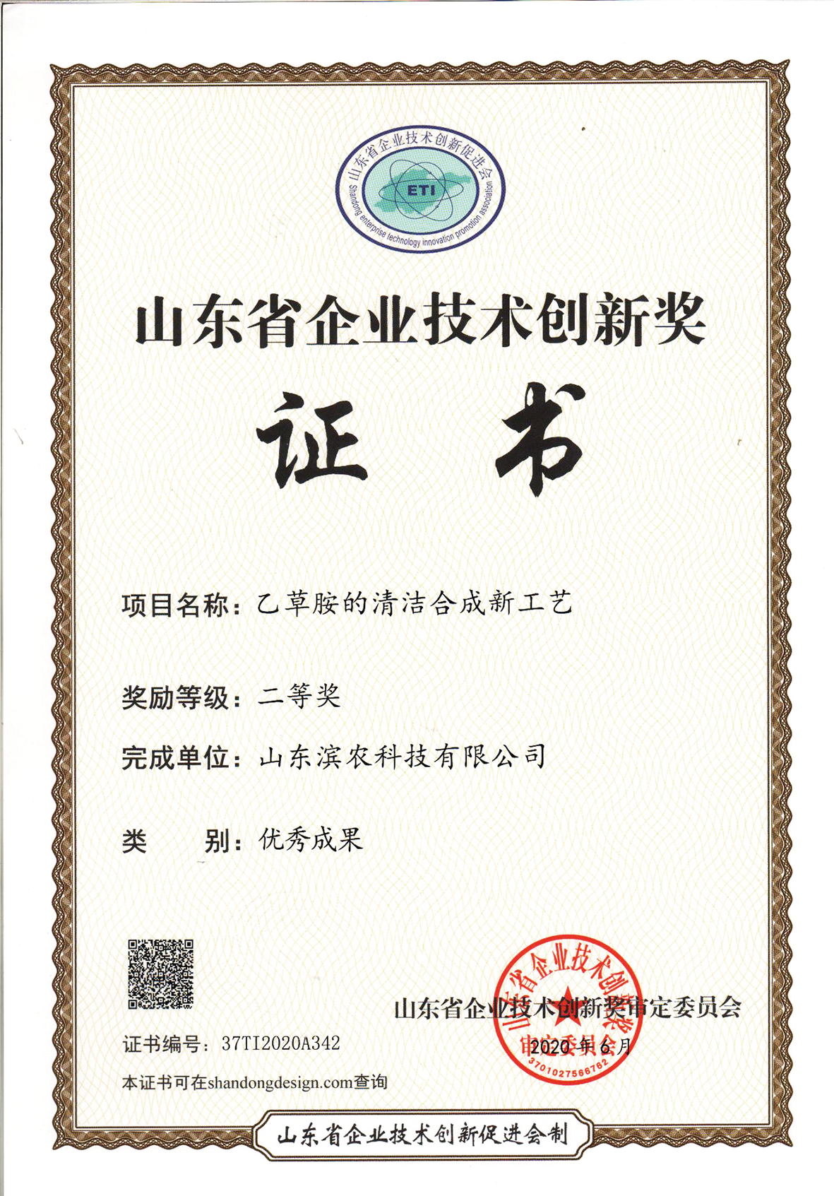 • ■2021-04-08 2020-08-05 我公司成果“乙草胺的清潔合成新工藝”榮獲山東省企業技術創新獎優