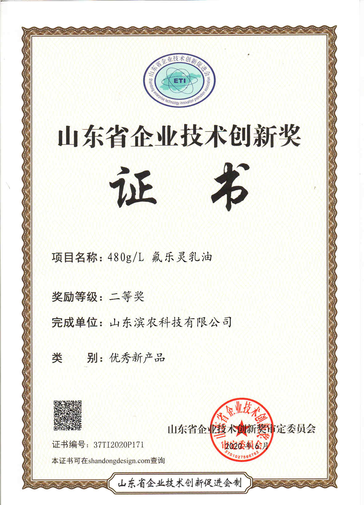 ■2020-08-05 我公司新產(chǎn)品480g/L氟樂靈乳油榮獲山東省企業(yè)技術創(chuàng)新獎優(yōu)秀新產(chǎn)品二等獎