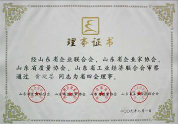 2009年7月1日,我公司董事長經山東省企業聯合、山東省企業家協會、山東省質量管理協會、山東省工業經濟聯合會審察通過為省四會理事。