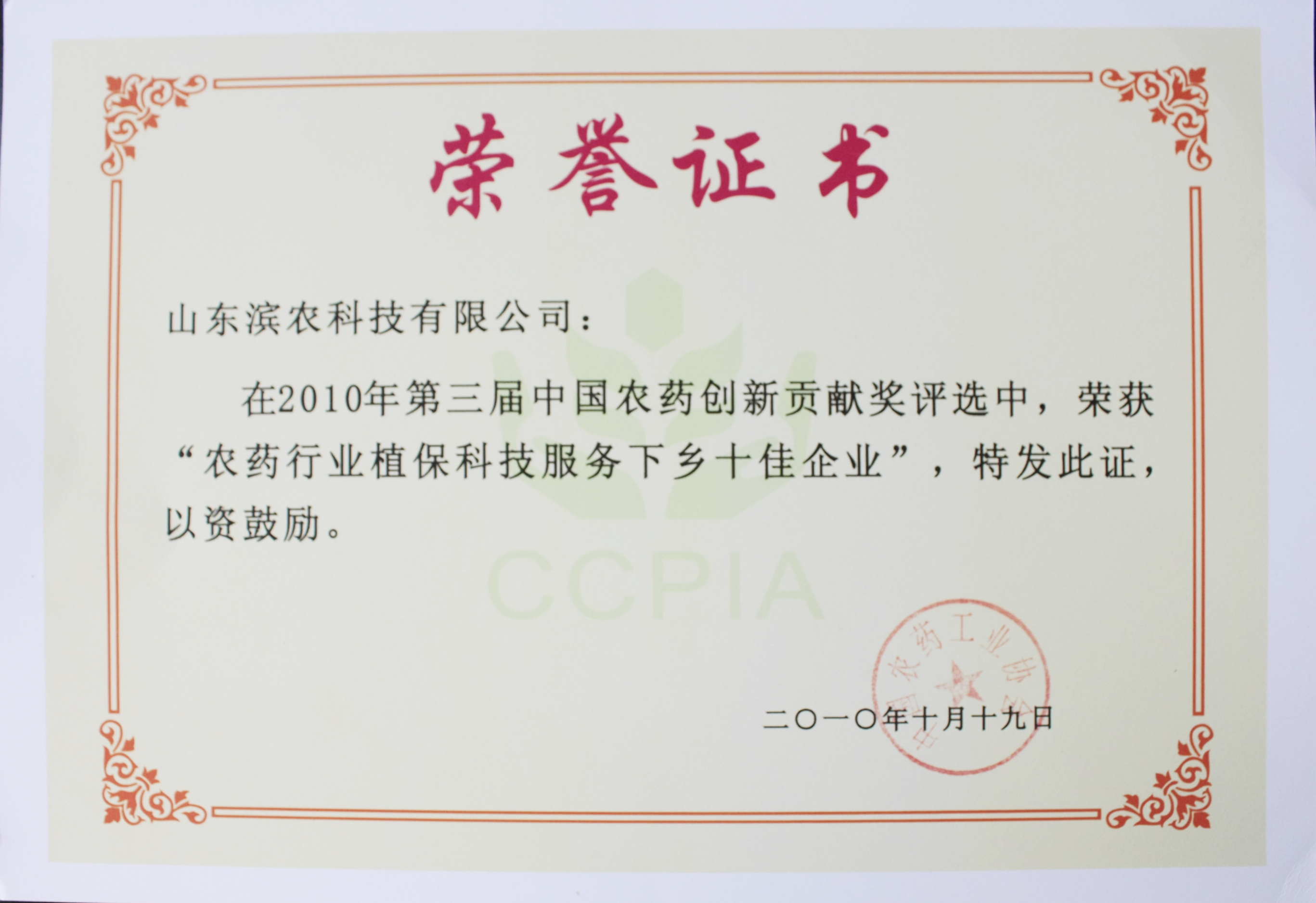 ■2010-10-20 我公司榮獲“中國農藥行業植保科技服務下鄉十佳企業”稱號