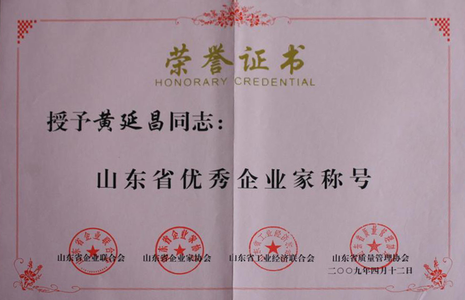 2009年4月12日,我公司董事長黃延昌被山東省企業聯合、山東省企業家協會、山東省工業經濟聯合會及山東省質量管理協會聯合授予山東省優秀企業家稱號。
