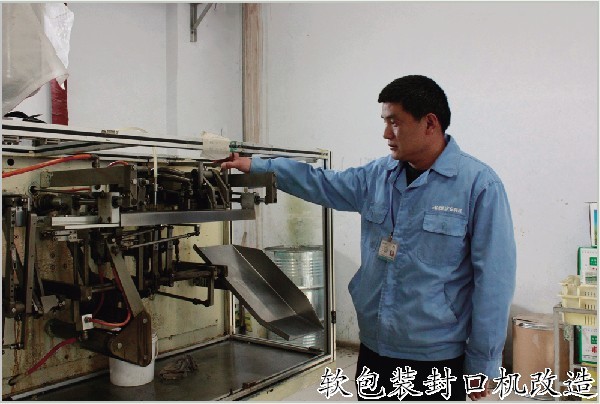 軟包裝車間粉劑水平包裝機由于機械磨損,容易導(dǎo)致頂封封口偏斜,需手動敲擊頂封托架調(diào)整,易損壞托架又影響工作效率,且調(diào)試中產(chǎn)生廢品多。今年在停機檢修時,設(shè)備班長楊訓(xùn)提議在頂封托架下方焊接帶絲空的鐵塊,通過螺栓調(diào)整封口偏斜,經(jīng)試驗取得良好效果,既方便又快捷,大大提高了效率。目前軟包裝車間已有5臺水平包裝機改制運行,此方法已得到設(shè)備技術(shù)部驗收; 近日,車間又在乳油車間安裝了一臺風(fēng)機,并在每臺設(shè)備上加設(shè)引風(fēng)管道,每個管道上加一蝶閥,控制風(fēng)量大小,緩解了車間氣味,極大地改善了車間生產(chǎn)環(huán)境。