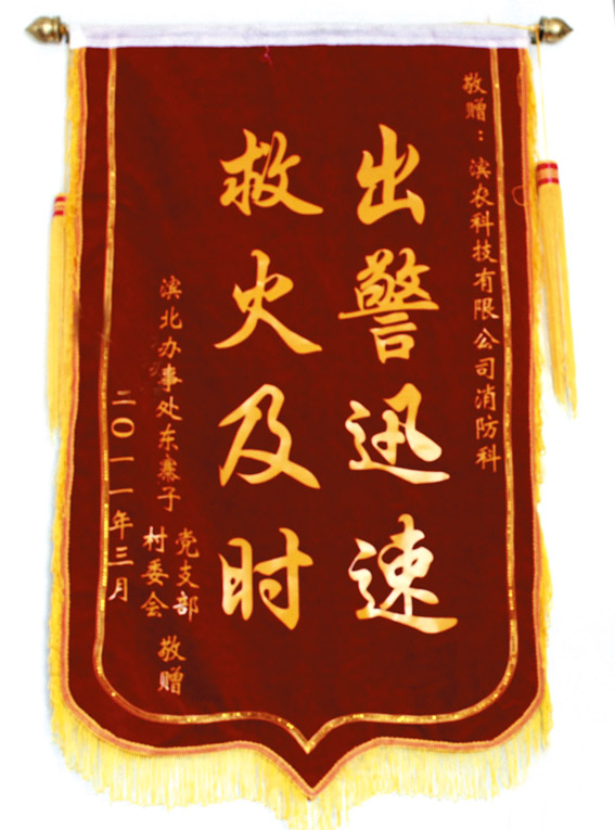 大火無(wú)情,韓隊(duì)立刻帶領(lǐng)三名員工迅速開(kāi)著公司配備的消防車趕往東寨子村。經(jīng)過(guò)二十多分鐘的奮戰(zhàn),終于將大火撲滅,保住了東寨子村幾十個(gè)大棚的安全。當(dāng)時(shí)已近中午,王副書(shū)記為感謝韓隊(duì),邀請(qǐng)韓隊(duì)等人一定吃了午飯?jiān)僮撸豁n隊(duì)委婉謝絕。事后,王副書(shū)記與村委主任送來(lái)一面書(shū)寫(xiě)著“出警迅速,救火及時(shí)”的錦旗表示衷心的感謝。