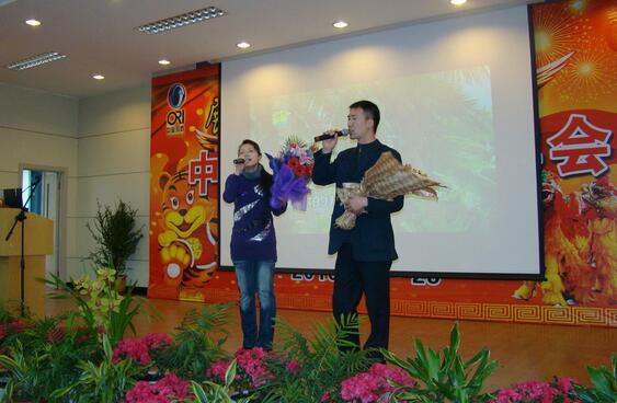年會(huì)的文藝演出在楊棟演唱的一首充滿喜慶氣氛的歌曲《恭喜發(fā)財(cái)》中拉開了帷幕。新來的酒谷董事和翻譯陳永強(qiáng)合唱的一曲日語版的《北國之春》也讓觀眾們耳目一新;來自一工廠的員工蘇醒一曲《姑娘我愛你》,勁歌熱舞、臺(tái)風(fēng)奔放,將現(xiàn)場(chǎng)的氣氛推向了高潮;徐根華總經(jīng)理也為大家深情演唱了一首《在路上》,贏得了全場(chǎng)觀眾的陣陣掌聲。在文藝演出的過程中還穿插了品種豐富的抽獎(jiǎng)活動(dòng),懸念迭出的抽獎(jiǎng)環(huán)節(jié)將現(xiàn)場(chǎng)氣氛一次次推向高潮。節(jié)目最后,一曲《明天會(huì)更好》寓意并祝福中金瑪泰的明天會(huì)更好,為這臺(tái)精彩紛呈的年會(huì)劃上了圓滿的句號(hào)。