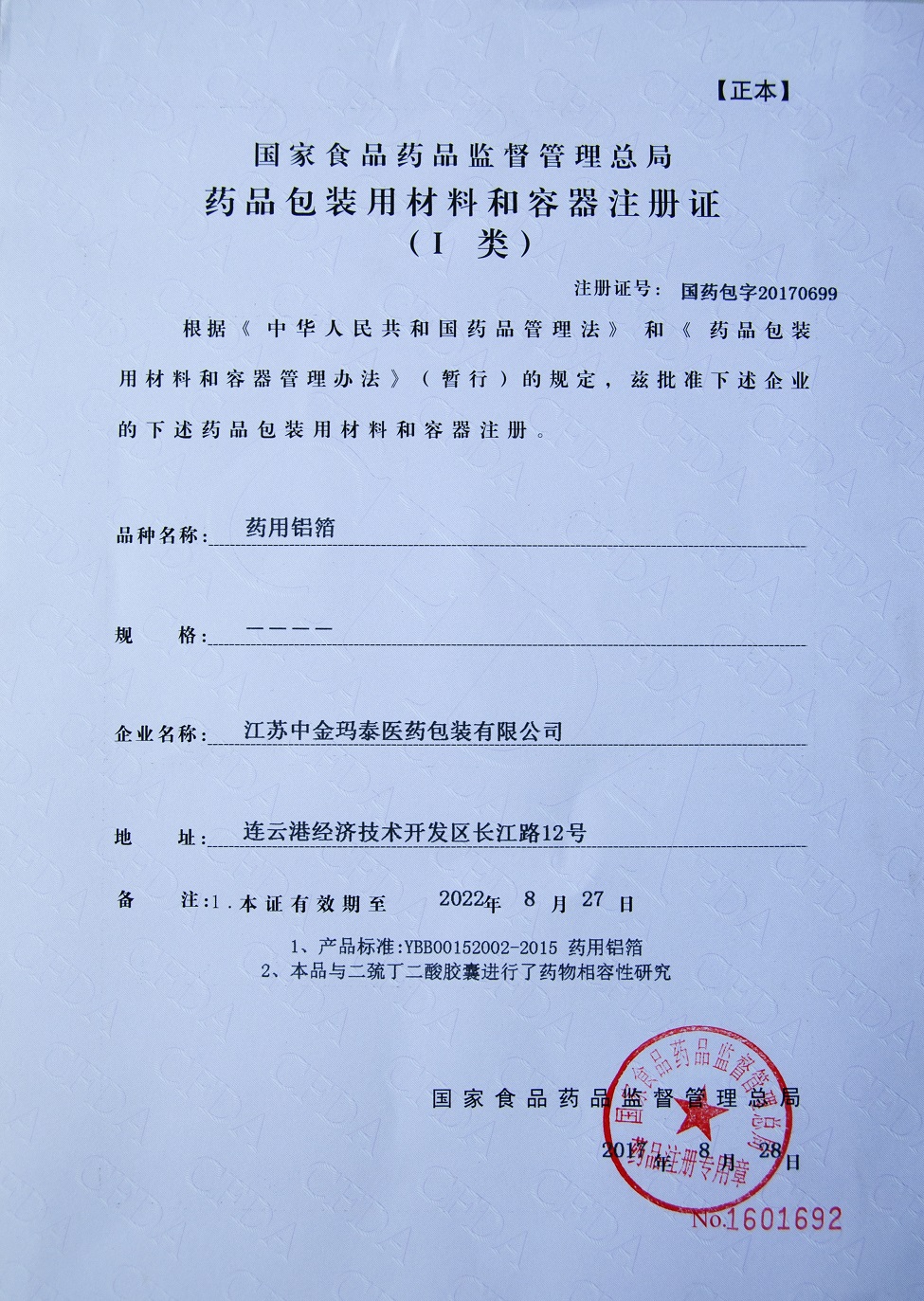 近日,中金瑪泰PTP新工廠藥用鋁箔產(chǎn)品取得由國家食品藥品監(jiān)督管理總局頒發(fā)的《藥品包裝用材料和容器注冊證》(I 類),注冊證號: 國藥包字20170699,注冊證有效期至2022年8月27日。