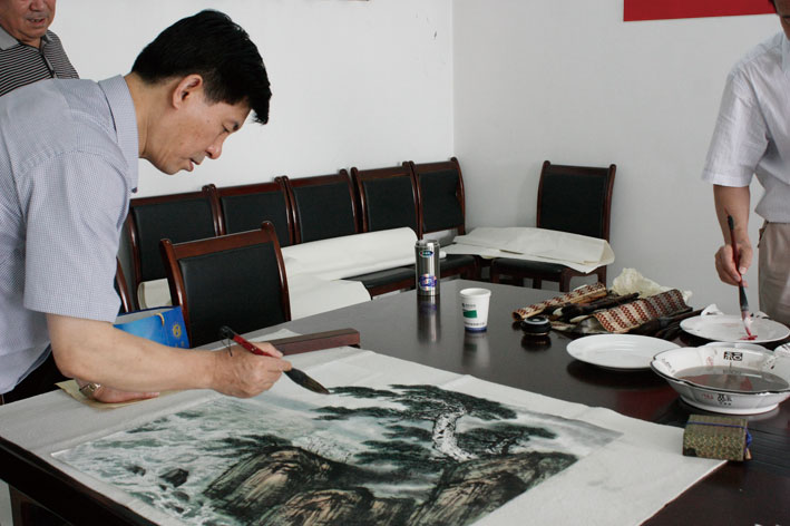 7月16日,山東省工商局副局長李學法等一行領導到我公司,董事長黃延昌熱情接待。上午,中國書畫家聯誼會理事、山東省美術家協會會員王慶臣等著名書畫家、書法家在我司會議室即興揮墨,現場作畫。風格多樣的繪畫作品栩栩如生,書法作品蒼勁有力,濃濃墨香洋溢在濱農園中。